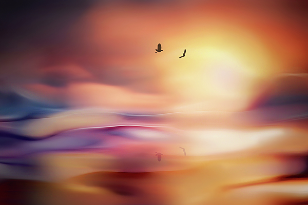 Two birds and their reflections - a flight into the sunset
