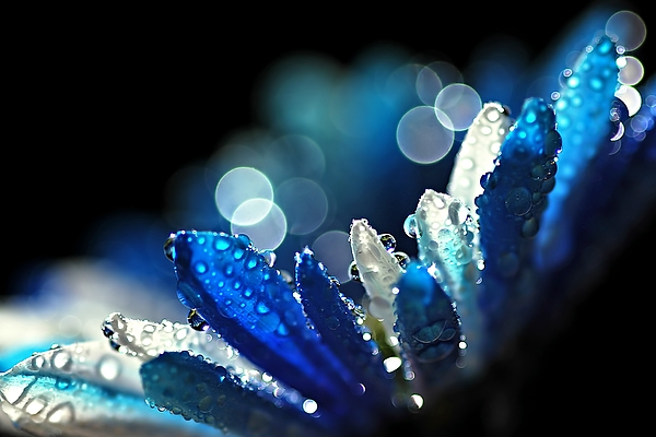 A stained blue daisy, with dew drops, showing that Winter and blue can definitely be beautiful